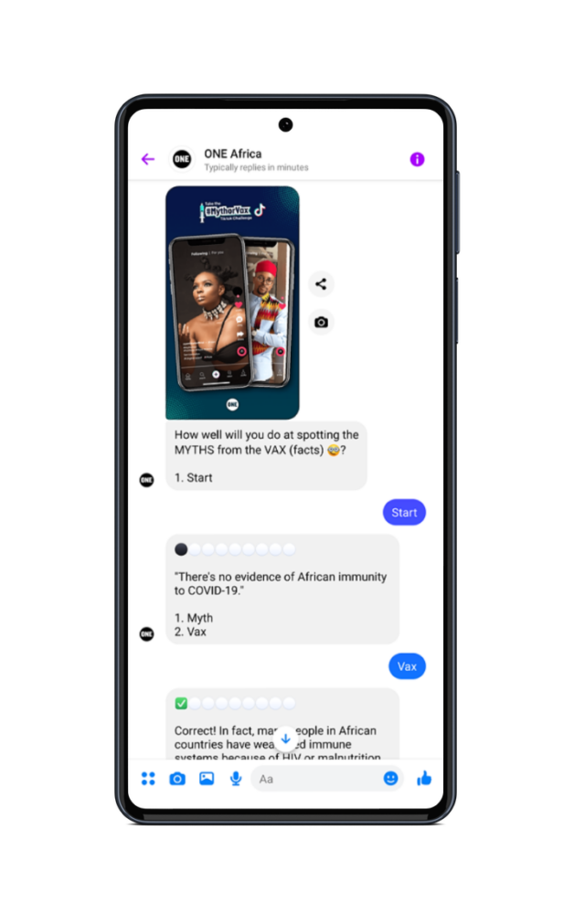 Le chatbot ONE Afrique vous permet d’en savoir instantanément plus sur le travail de ONE, de vous tenir au courant des campagnes en cours et de trouver des moyens d’agir par le biais d’un chat conversationnel sur votre téléphone portable – où que vous soyez !