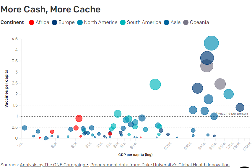 The world’s richest countries are on track to accumulate over 1 billion more doses of COVID-19 vaccines than they need to fully vaccinate all their citizens, according to new analysis from ONE’s Policy team. Meanwhile, the rest of the world has only been able to secure 2.5 billion doses of the most promising vaccines — leaving billions of people with little hope of receiving a vaccine this year. These excess doses purchased by rich countries alone would be sufficient to vaccinate the entire adult population of Africa.