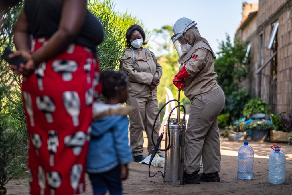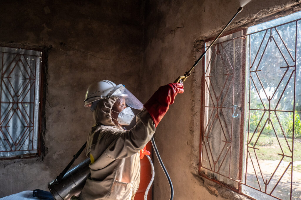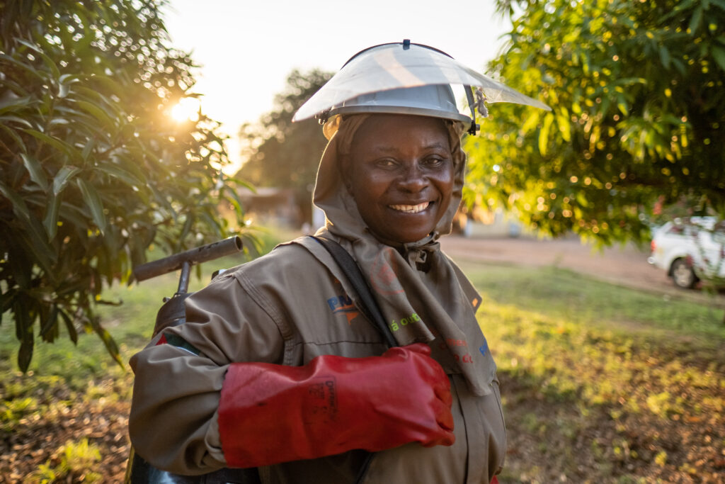 Neben der Durchführung der Sprühmaßnahmen sprechen Adelaide und ihr Team mit den Familien über Malariaprävention und erklären ihnen, wie sie die Symptome erkennen und wohin sie sich für Tests und die Behandlung wenden können.