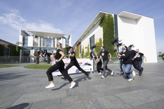 Um die Aufmerksamkeit von Bundeskanzler Olaf Scholz zu erregen, haben unsere Aktivist*innen in Deutschland buchstäblich für großes Summen um sein Büro gesorgt. Mit behelfsmäßig gebastelten Moskitos standen sie vor dem Kanzleramt und machten mit summenden Geräuschen auf sich und die Arbeit des Globalen Fonds im Kampf gegen Malaria aufmerksam.