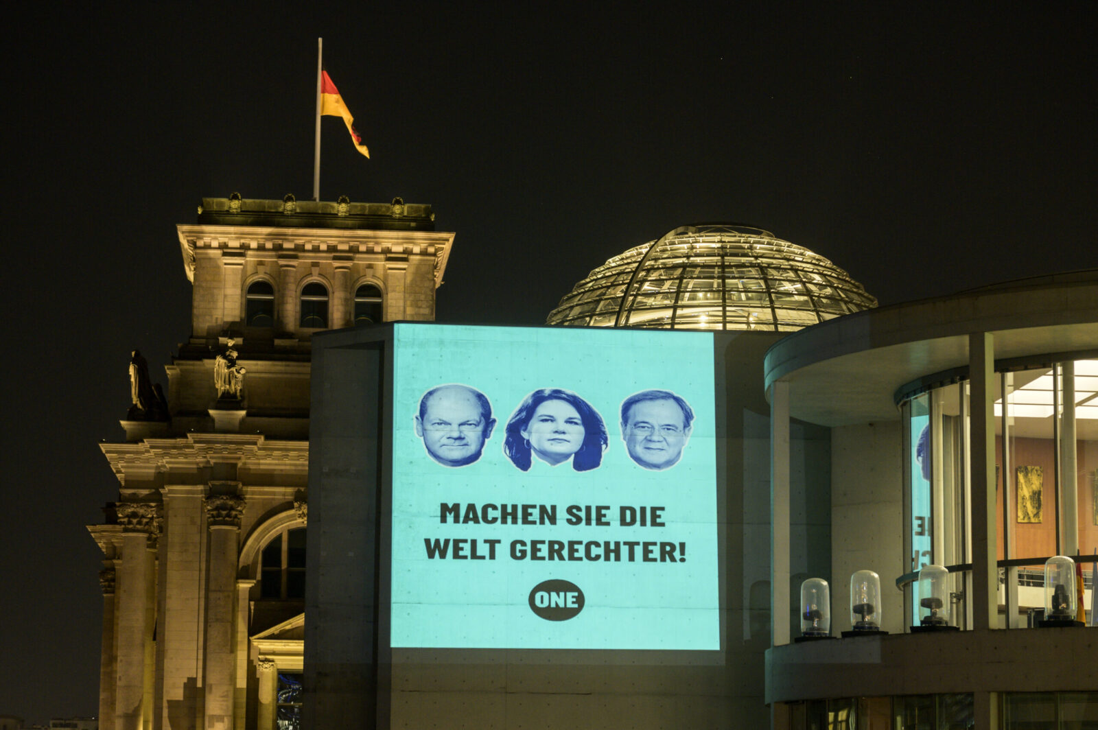 Das Thema Globale Gerechtigkeit kam während des Wahlkampfes viel zu kurz. Das wollten wir ändern: Vor dem anstehenden TV-Triell bei ARD & ZDF projizierten wir daher eine Botschaft an das Bundeskanzleramt und vor den Reichstag: Zu sehen waren die Köpfe der drei Kanzlerkandidat*innen verbunden mit dem Aufruf “Machen Sie die Welt gerechter!”. So wollten wir kurz vor der Wahl nochmal richtig Druck auf die Politiker*innen ausüben und die Aufmerksamkeit der Medien gewinnen. Zu fünft zogen wir mit Lastenfahrrad und Beamer los und brachten das Regierungsviertel zum Leuchten. Das Passende: Zeitgleich fand zudem das “Festival of Lights” in Berlin statt. So blieb unsere Guerilla-Projektions-Aktion lange unbemerkt und die Foto-Journalist*innen konnten ungestört tolle Fotos machen, die es sogar in einige Medien geschafft haben!