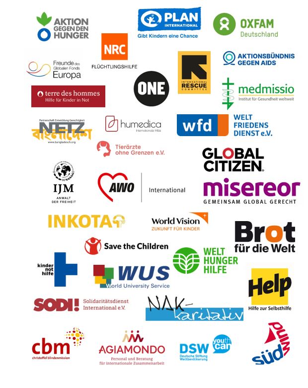 Agiamondo, Aktion gegen den Hunger, Aktionsbündnis gegen Aids, AWO International, Brot für die Welt, Christoffel-Blindenmission (cbm), Deutsche Stiftung Weltbevölkerung, Freunde des Globalen Fonds Europa, Global Citizen, Help – Hilfe zur Selbsthilfe, Humedica, Inkota, International Justice Mission (IJC), International Rescue Committee (IRC), Kindernothilfe, Medimissio, NAK-Karitativ, Netz Bangladesch, NRC Flüchtlingshilfe, ONE, Oxfam, Plan International, Save the Children, Solidaritätsdienst International, Südwind-Institut, Terre des Hommes, Tierärzte ohne Grenzen, Weltfriedensdienst, Welthungerhilfe, World University Service und World Vision.