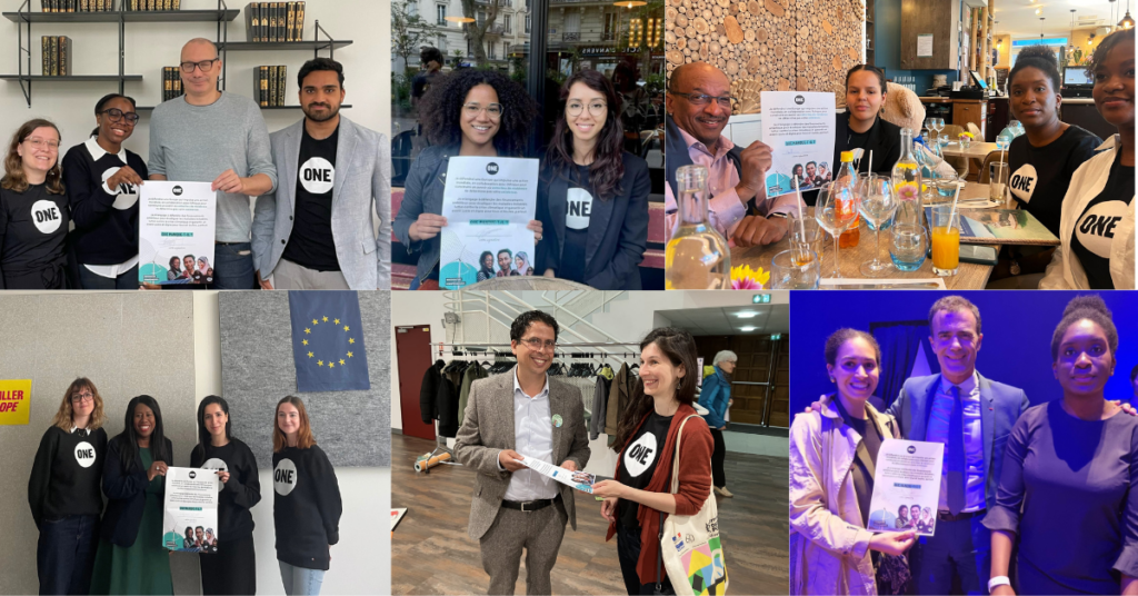 En collaboration avec les autres jeunes Ambassadeurs et Ambassadrices de Belgique, des Pays-Bas, d’Allemagne et d’Italie, ce sont au total 80 candidat·e·s aux élections européennes puis eurodéputé·e·s à travers l’UE qui ont signé la résolution de ONE, acceptant ainsi de porter ces valeurs de solidarité et ces engagements dans le cadre de leur mandat.