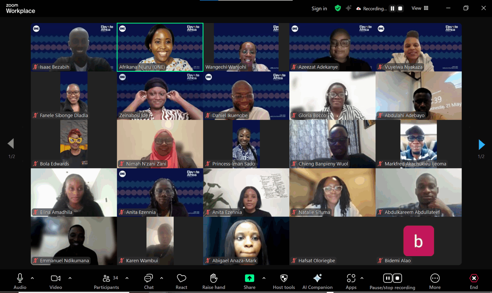 The session concluded with a collective call to action: to read the special Africa Day 2025 edition of the ONE Champions newsletter, follow ongoing campaigns via ONE and Elevate Africa platforms, and continue co-creating solutions rooted in African realities. A mentimeter word cloud capturing reflections from participants was also shared, contributing to the collective momentum of celebrating Africa’s resilience, leadership, and return.