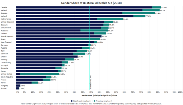 In 2018, just over US$45 billion, or about 44% of bilateral allocable aid from DAC donors and the EU institutions, focused on gender equality as either a significant or a principal objective. This is aid tracked using the DAC gender markers, which assess whether, regardless of their sector, projects have a positive impact on advancing gender equality, reduce gender discrimination, or meet gender-specific needs.