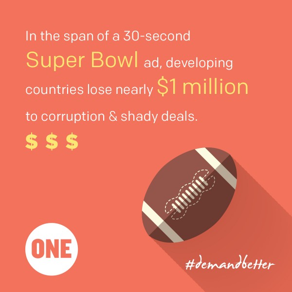 In the span of a 30-second Super Bowl ad, developing countries lose nearly $1 million to corruption and shady deals.